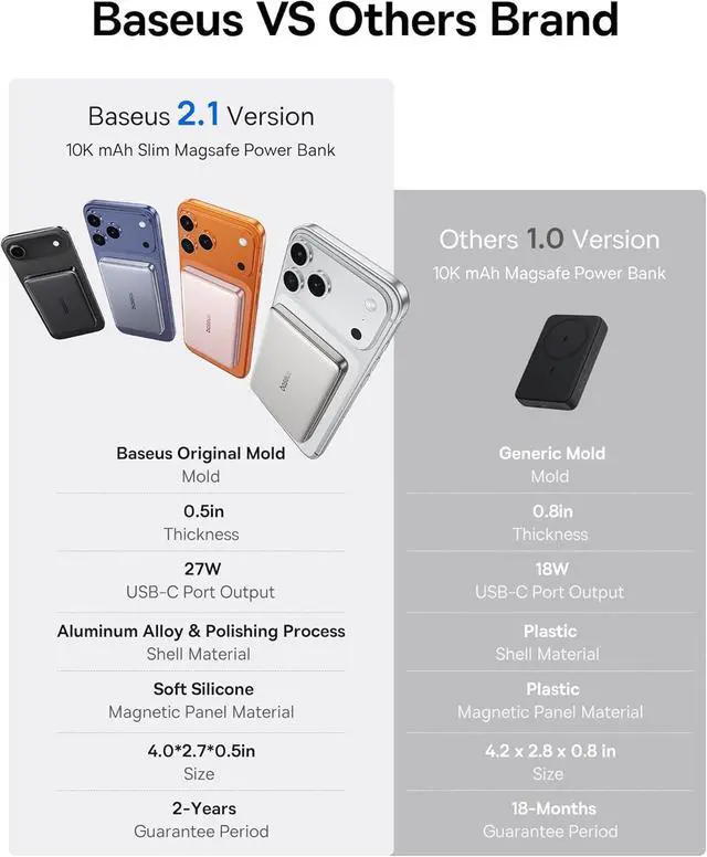 (Note: Slight warmth from normal energy conversion is completely normal. )?? About BaseusBaseus holds 2 100+ global patents and 170+ industrial design awards trusted by users in 180+ countries (over 300 million total) with 99.98 % customer satisfaction. Our iPhone portable charger meets top global standards certified by FCC UL TüV DOE CEC UN IEC and RoHSguaranteeing safety energy efficiency and environmental compliance.?? Baseus Promise to YouYoull receive 1* Baseus Picogo 27W 10000mAh Magnetic Power Bank 1* user manual a 24-month warranty and lifelong 24/7 professional support. Enjoy free returns or replacements for guaranteed satisfactionour team delivers swift helpful solutions for any technical or product inquiries.