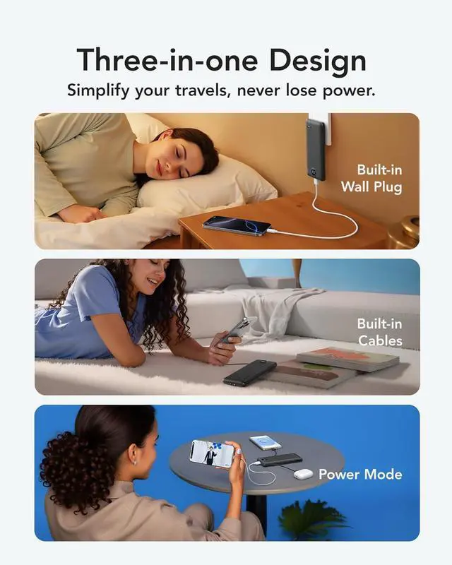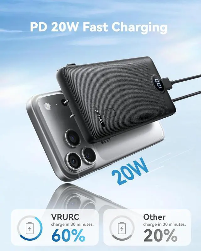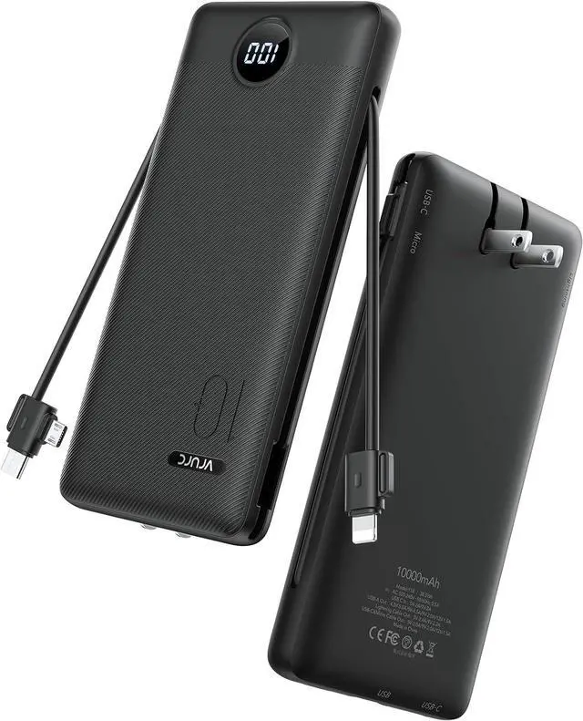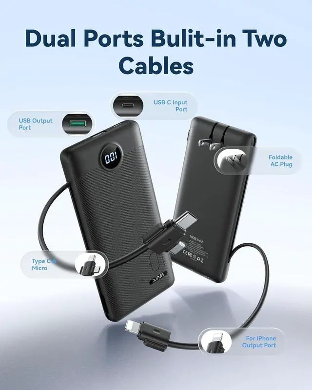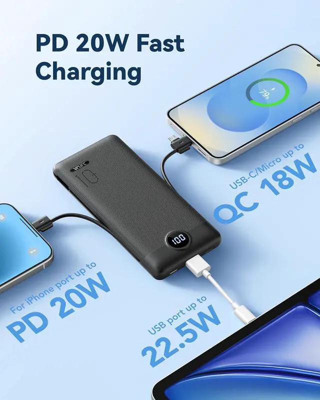 [Supports Up to 22.5W Fast Charging] This portable charger with cables supports 22.5W fast charging overcharge protection through its USB port. Additionally it boasts built-in cables supporting PD 20W and QC 18W ensuring efficient and rapid charging capabilities. [Multiple Devices Portable Charger With Built-in AC Wall Plug] This portable charger not only features built-in Micro USB-C and for iPhone charging cables but also includes USB and USB-C ports for added versatility. Moreover the portable phone charger incorporates a built-in wall plug enabling direct charging of the power bank from a wall outlet. [Smart Digital LED Display] The smart digital LED display provides a quick overview of remaining power.