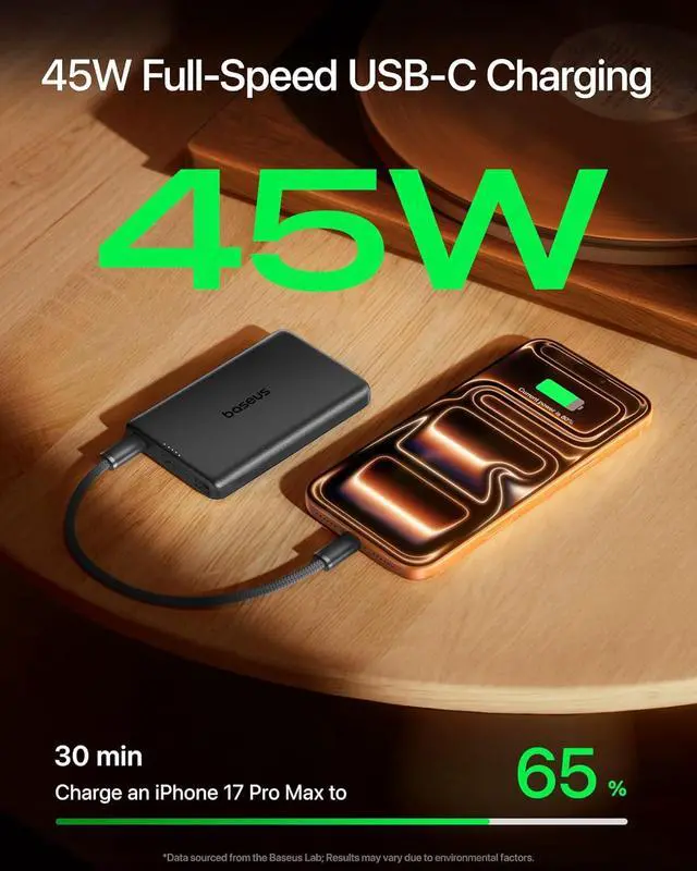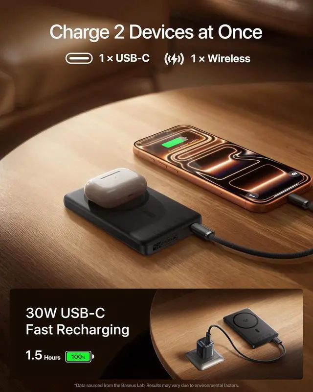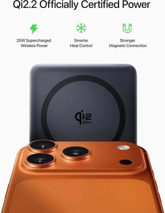 Qi 2.2 Certified & Ultra-Fast 25W Wireless ChargingPowered by official Qi 2.2 certification the Baseus Picogo AM52 magnetic power bank delivers stable fast 25W wireless fast charging for iPhone 17/16 and Qi 2.2 -enabled devices. It can charge an iPhone 17 Pro up to 50% in just 34 minutes greatly reducing waiting time and keeping you powered on the go. Ideal for daily commutes business trips travel and fast-paced lifestyles.