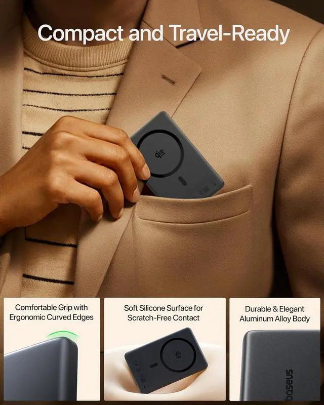 Its flight-friendly capacity meets TSA guidelines making it the perfect travel companion. Enjoy reliable on-the-go charging wherever you are. Stronger Magnetic Alignment and Premium DesignFeatures ultra-precise magnetic alignment with enhanced hold the powerful array of magnets lets you snap your iPhone 17 Pro Max on firmly ensuring perfect attachment every time. Nano-coated silicone magnetic panel offers a silky soft touch that is waterproof and fingerprint-resistant while gently silicone also cushions and protects your phones back from scratches and damage. Premium aluminum alloy casing delivers enhanced durability and a sleek look making it ideal for daily use. Not compatible with non? MagSafe cases as they may cause overheating. Compatibility NoticeThis magnetic power bank is designed for MagSafe-compatible iPhones (iPhone 12 and newer) for secure attachment and optimal wireless charging. iPhone 16/17 supports up to Qi 2.2 25W wireless charging while iPhone 12/13/14/15 series max out at Qi2 15W. Other Android phones ( Google OnePlus Motorola etc. ) only support wired USB-C charging they will not support the magnetic feature or achieve the 15W or 25W wireless charging speed and will charge at a lower efficiency. Enjoy 24-month worry-free guarantee with genuine Baseus quality assurance.