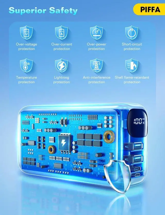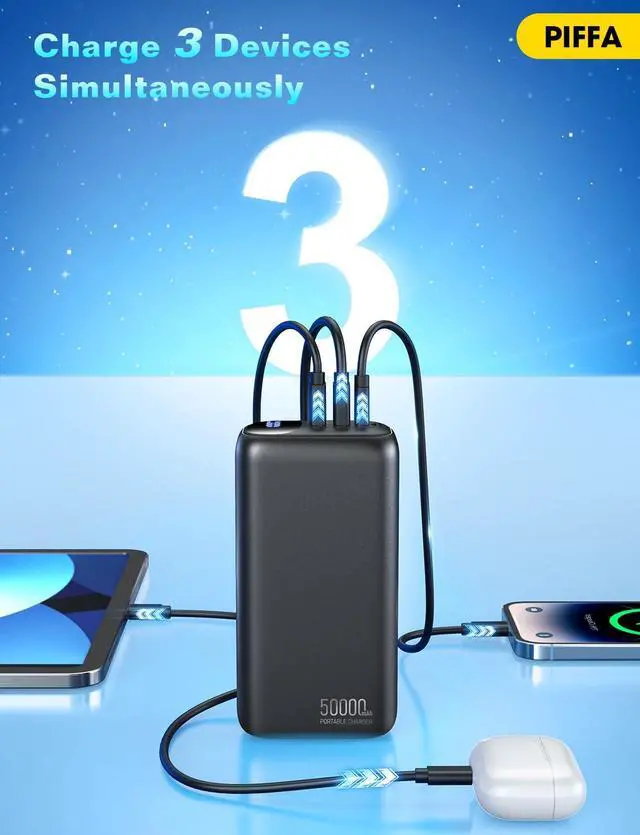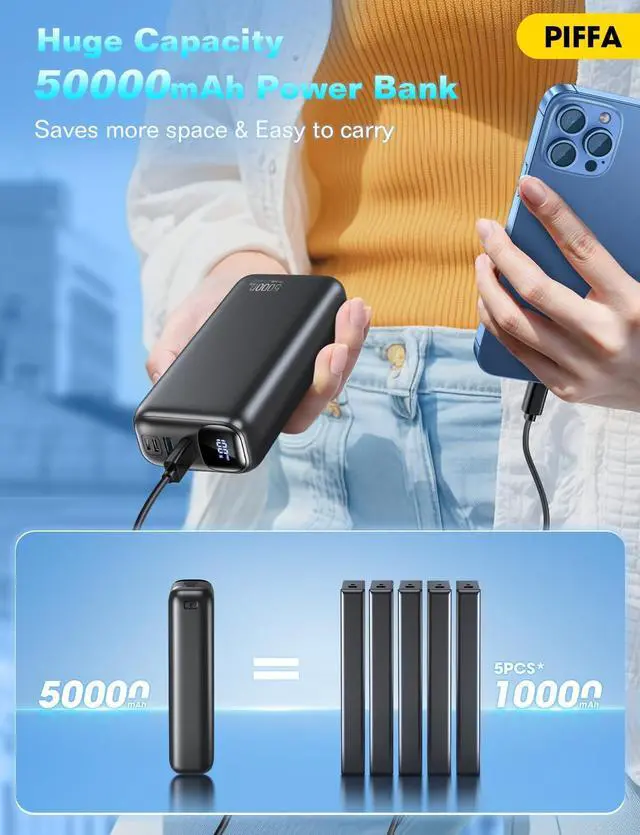 (NOTE: 50000MAH POWER BANK MAY NOT BE ALLOWED ON AIRPLANES PLEASE CONFIRM FURTHER WITH YOUR AIRLINES)3 Devices Simultaneous Charge: PIFFA portable charger enables you to charge three devices concurrently. It features multiple ports including USB - C with 3 Outputs and 2 Inputs supporting PD 3.0 and QC 4.0. This setup ensures efficient charging for a variety of your devices. Universal Compatibility Designed to be your ultimate charging partner PIFFA portable power bank is highly compatible. The battery bank works seamlessly with a vast range of devices serving as a perfect power bank for iPhone 16/15/14/13/12 Pro as well as Android models S23 S22 S21 tablets like iPad and other small gadgets such as Airpods. LED Display & Safety ProtectionThe intuitive LED display on PIFFA portable charger power bank lets you check the remaining battery level at a glance. Plus it has reliable safety protection features: the battery bank equipped with smart chips prevents overcharging overvoltage overcurrent and short - circuits ensuring the safety of both the power bank and connected devices during charging.