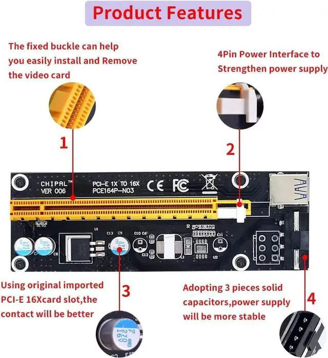 Compatible with 1x, 2x, 4x, 8x, 16x PCI-E motherboard slots. With side clamps to fix other cards, no need to drive, dedicated to Bitcoin mining.