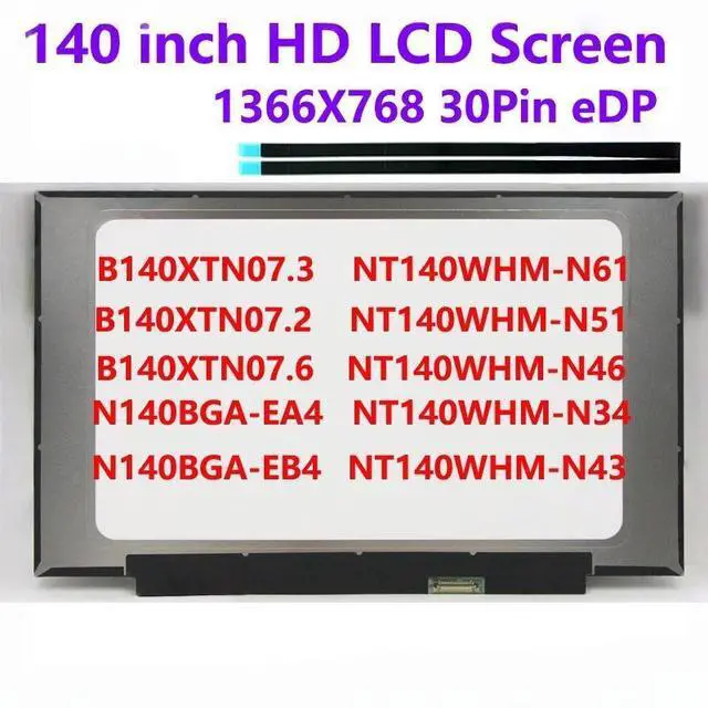• 14 Inch Laptop LCD Screen B140XTN07.3 B140XTN07.2 07.6 NT140WHM-N46 N34 N43 N51 N61 N140BGA-EB4 N140BGA-EA4 1366x768 30 Pins EDP