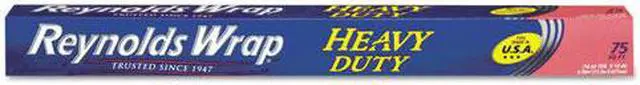 Heavy duty aluminum foil tears easily with standard cutting edge. Practical for cooking, serving and wrapping food. Use as pan liner; makes later cleanup easy. Effective for locking in flavors when grilling or preventing freezer burn when storing leftovers. Material(s): Aluminum; Length: 75 ft; Width: 18"; Packing Type: Box.