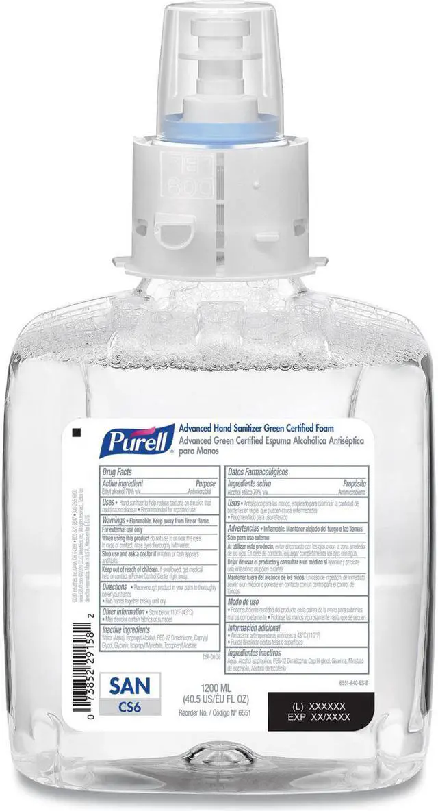 Hand sanitizer that contains ingredients made from natural renewable resources. Kills 99.99% of most common germs that may cause illness. Green certified. Meets EcoLogo hand sanitizer standard for environmental leadership and proven performance. Scientifically advanced formulation outperforms other hand sanitizers ounce for ounce. Foam Hand Sanitizer Refill—PURELL CS6 Dispensers. Hand Sanitizers Type: Foam; Color(s): Clear; For Use With: PURELL CS6 Dispensers; Capacity (Volume): 1,200 mL.
