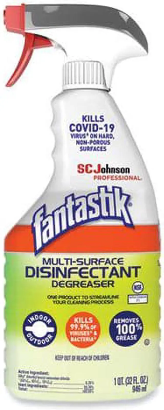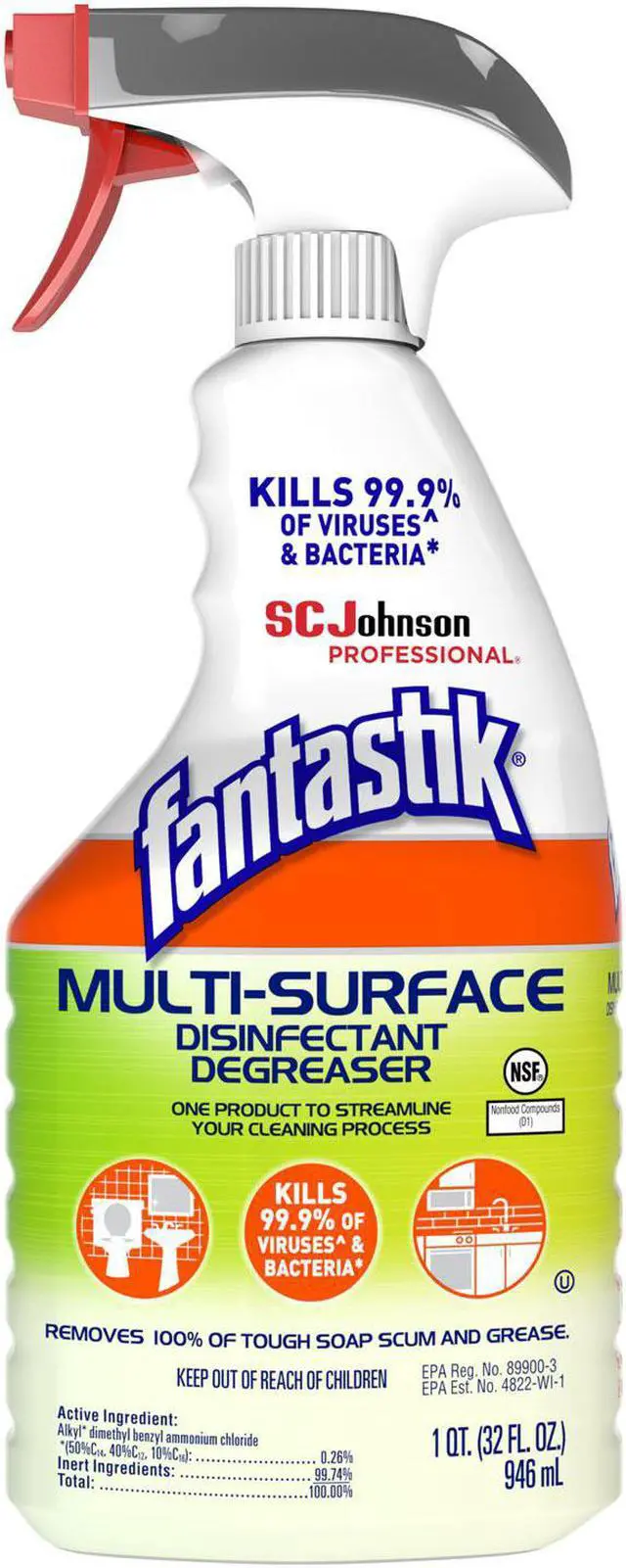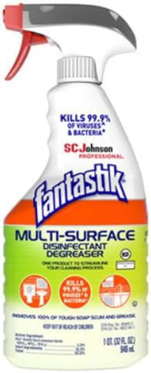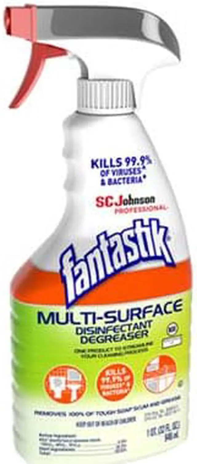 SC Johnson Professional Fantastik Multi-Surface Disinfectant Degreaser kills 99.9% of bacteria, and cuts through tough grease and grime on most surfaces. Clean, disinfect, degrease and deodorize your kitchen and restroom hard, non-porous surfaces. Application: Disinfectant Cleaner; Applicable Material: Acrylic; Aluminum; Bronze; Brushed Nickel; Chrome; Fiberglass; Quartz; Sealed Granite; Sealed Marble; Stainless Steel; Tile; Chemical Compound: Alkyl dimethyl benzyl ammonium chloride (50%C14, 40%C12, 10%C16): 0.26%; Dirt Types: Crayon; Fingerprints; Grease; Grime; Oil; Organic Matter; Pencil; Smoke Film; Soap Scum.