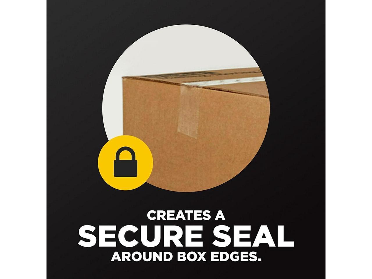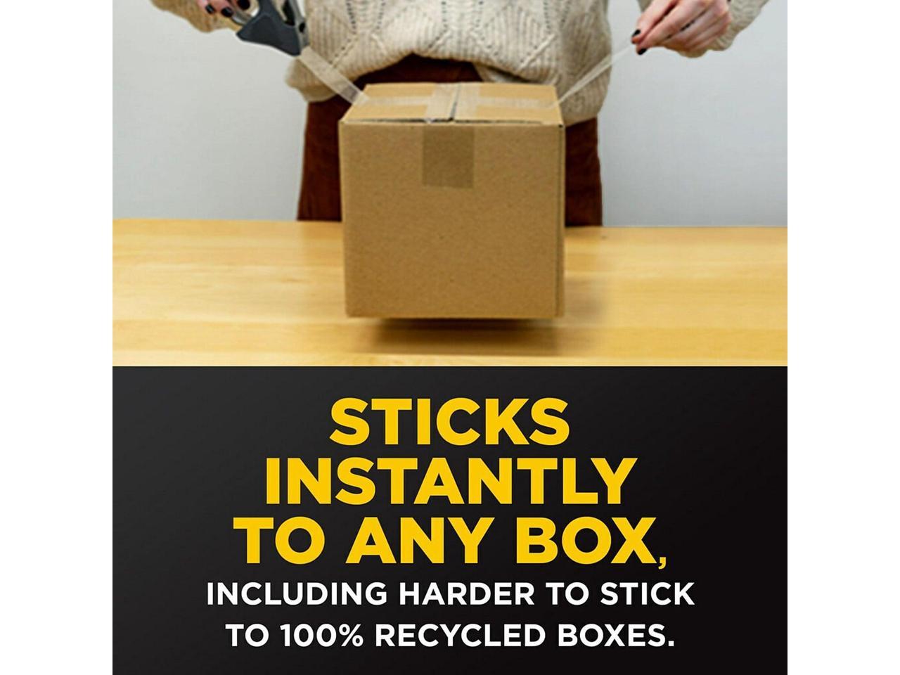 - Sticks instantly to any box!. New advanced adhesive creates a secure seal over box edges seams. Crystal clear and clear-to-core. Includes refillable dispenser that delivers a clean cut, and fall-back tabs helps ensure the tape doesnt fall back on the roll.