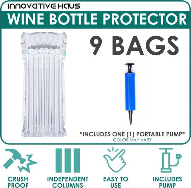 Innovative Haus Pack of 9 Wine Bottle Protector Bag with Free Pump. Inflatable Air Columns Cushioning Safe Transportation of Glass Bottles While Traveling on Airplane. Premium Packaging Materials