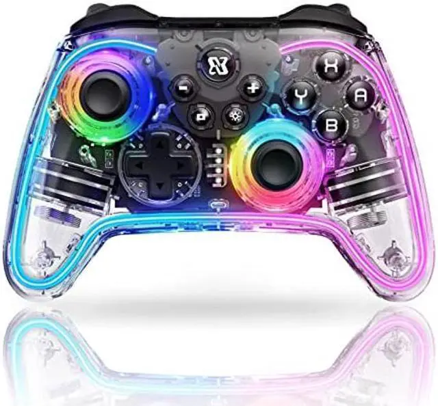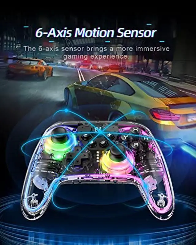 [(Transparent Crystal Design, 7-color RGB Lighting, and 4 Lighting Modes)] The switch pro controller features a 7-color RGB lighting ring around the outer edge and joysticks, with 4 lighting modes available: solid color, single-color gradient, two-color gradient, and rainbow gradient. The transparent crystal design and multiple lighting options provide a visually stunning experience.