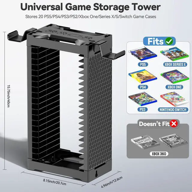 Video Game Storage Tower Holder with Controller Stand, Wall Mount Game Organizers and Storage for Nintendo Switch 2/ PS5/4/ XboxOne/Series, Vertical & Horizontal Stand for 20 Gaming Discs Accessories