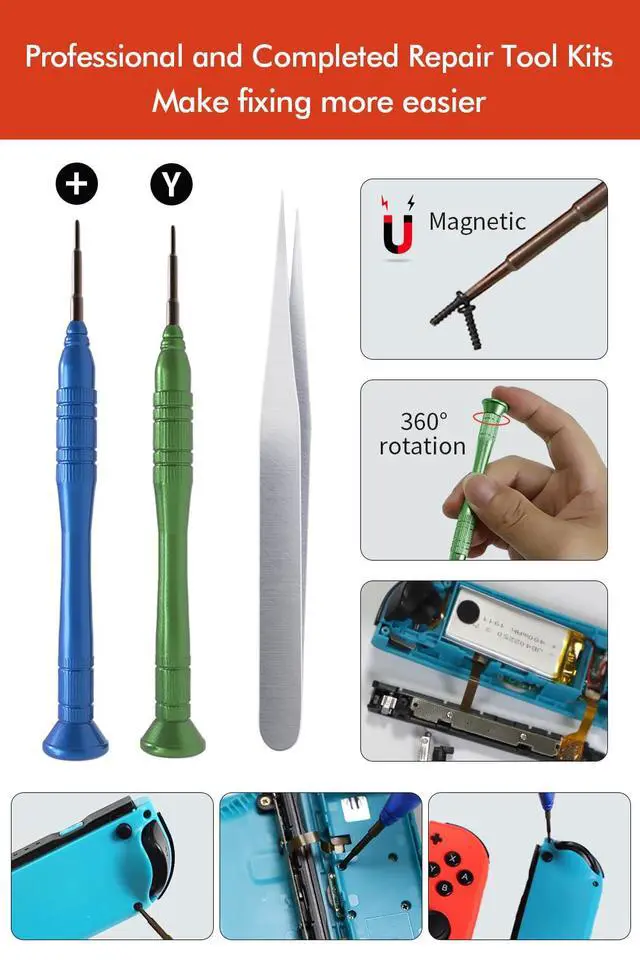 - Comprehensive Repair Kit: Our kit doesn't just stop at screwdrivers. You'll find a Joycon opener, spudger, tweezers, and four extra Y1.5 screws included. These tools simplify the repair process, while the additional screws prevent any mishaps during your repair journey.