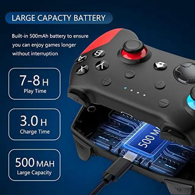 [(Long Playing Time)] :The wireless remote switch controller built in 500 mAh rechargeable battery.Gaming Time: Approx. 6-8 hours / Standby Time: Approx. 25 days / Charging Time: Approx. 2 hours.Wireless Transmission Distance: <= 26 feet.Enjoy your game continuously.