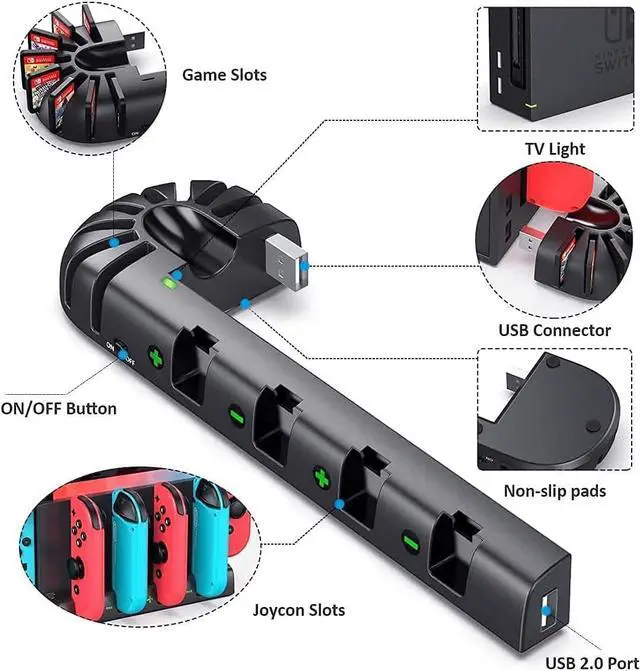Better Replacement for Nintendo Switch Original & OLED Model Joycons Charging Dock This Switch controller charger dock station matches the switch TV dock station for OLED model & Original version perfectly, charging 6 joycon controllers at the same time. It's must have switch controller charging dock for Nintendo Switch gamers, this joy con charge station is upgraded with 8 game slots to keep your gaming desktop tidy and space saving.