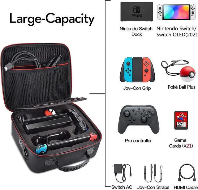 SWITCH STORAGE CASE - Specially designed switch case for Nintendo Switch Console or Switch OLED Model (2021), and Switch Dock, Switch AC Charging Adapter, Joy-Con Grip, Joy-Con Straps, and HDMI Cable, Poké Ball Plus, Switch Pro controller, also hold 21 game cards and other switch accessories.