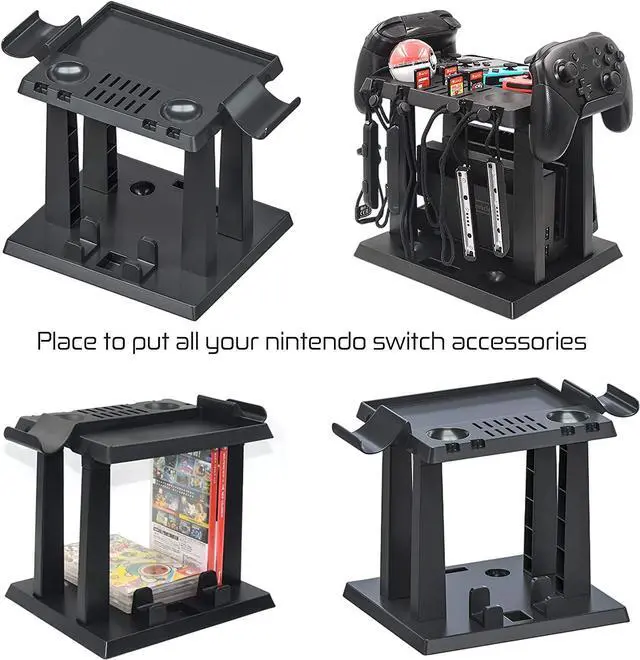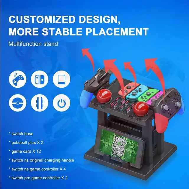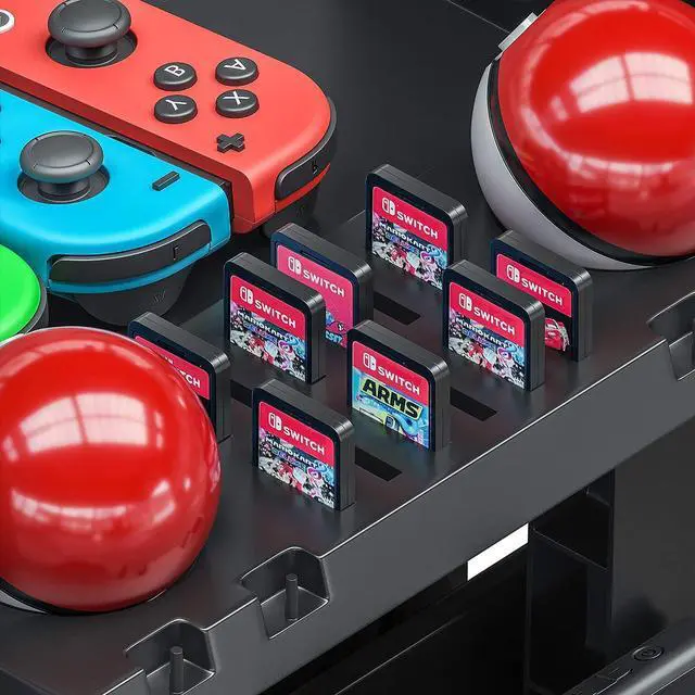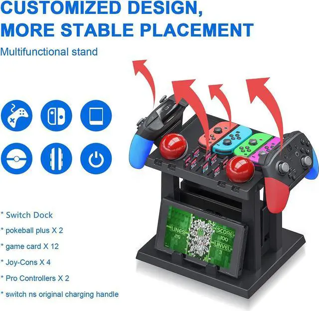 • MULTIFUNCTIONAL STORAGE STAND FOR NS Vertical stand, specially design for nintendo switch game holder, suitable for 1*TV Dock, 2*Pro controllers, 4*Joy cons, 4*Joy con straps, Switch games, 2*Poke Ball plus controllers, holds up to 12 game cards.