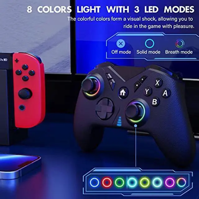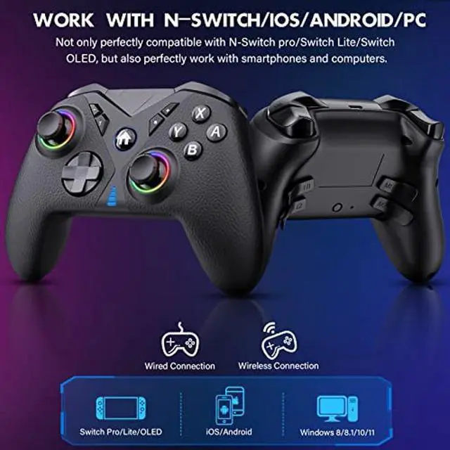 This is a wireless pro controller for switch/switch lite/switch oled which is also compatible with Windows/PC/iOS/Android 9. A cost-effective muti-platform LED switch oled controller grip that has wireless and wired connection ways.