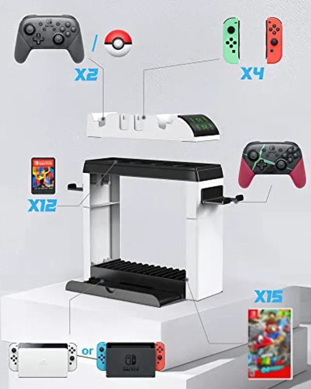 [(ALL-IN-ONE Storage Stand & Charging Dock)] : Designed to store and charge for 2 Nintendo Switch Pro controllers and 4 Joy Cons, your poke ball plus also can be charged at the switch charging station. Storing 12 game cards and 15 game card boxes at the same time. Two extra hooks on the side can hang two Pro controllers. Can meet your storage, charging and tidy needs.