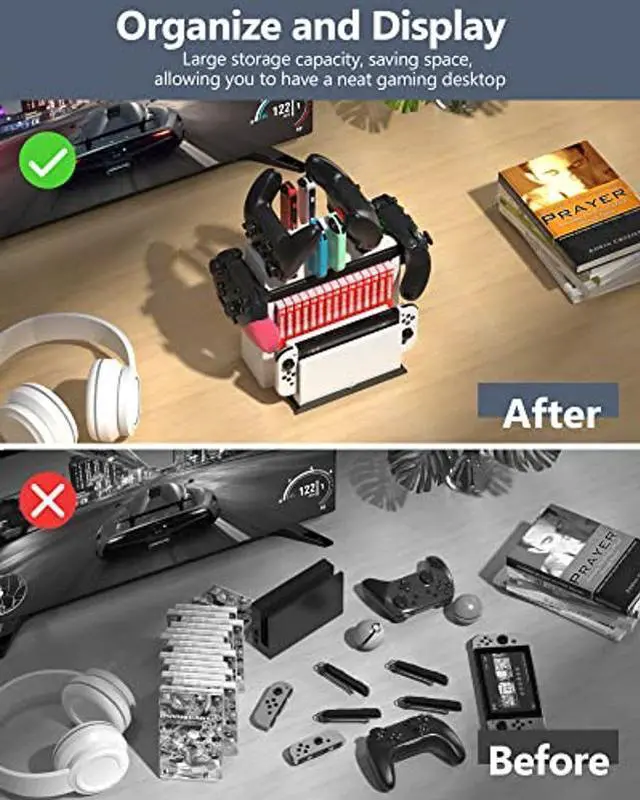 [(Keep Neat and Save Space)] : This switch organizer stand can keep organized for joycons, controllers and for poke balls. Enables your all consoles and game card boxes in a vertical position. This switch tower organizer stand will help you save the space and display your favourite console well. You can store your games to keep them in order and within reach. It must be a perfect gift for Nintendo Switch gamer.