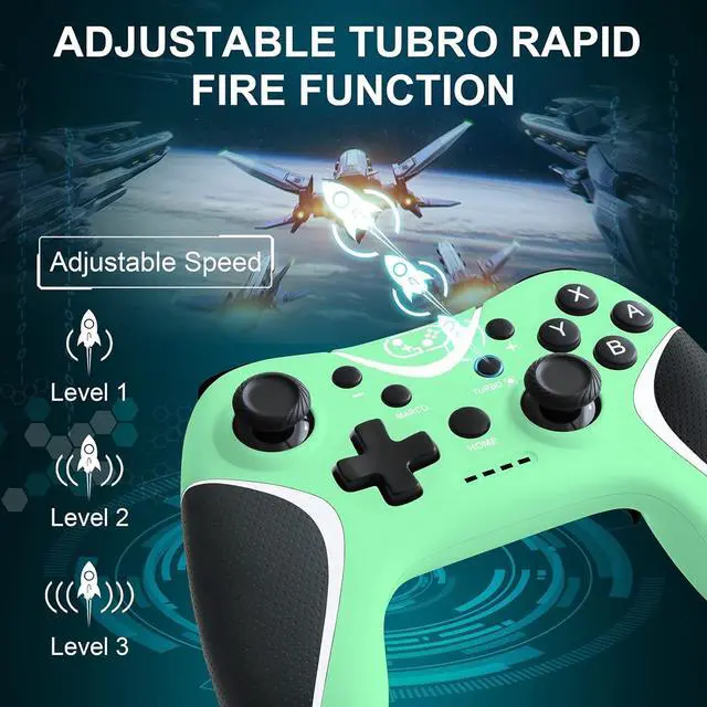 The non-slip design of switch controller that allows you to control the game stably . The wireless switch controller with adjustable 3-speed turbo speed and auto fire function, it has fast shooting game turbo speed. A/B/X/Y/L/ZL/R/ZR all buttons can be set to TURBO, which make it easier to win an arcade or action game.
