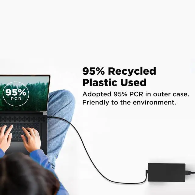 Eco-friendly adapter adopted 95% PCR recycled plastic in casing.