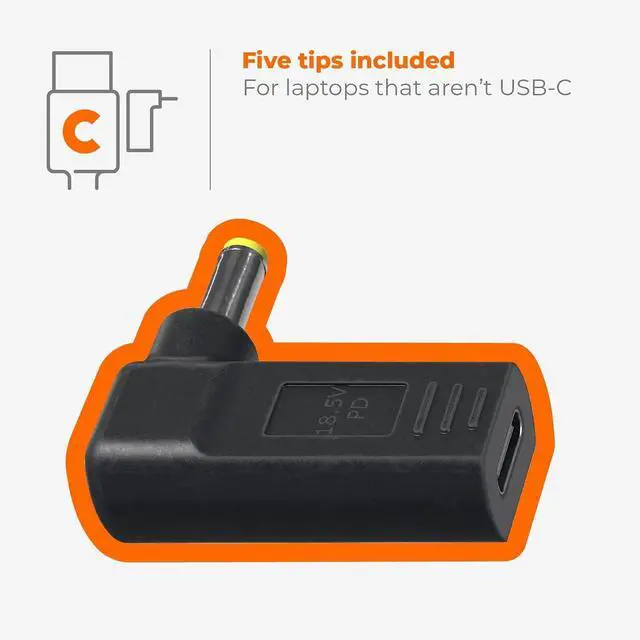 MULTIPLE CHARGING TIPS - Features 5 tips including USB-C to 4.0 x 1.7mm, USB-C to 3.0 x 1.1mm, USB-C to 11.0 x 4.5mm, USB-C to 5.5 x 2.5mm & USB-C to 4.75 x 1.7mm. Securely attach the appropriate tip to the USB-C cable and plug it into your laptop