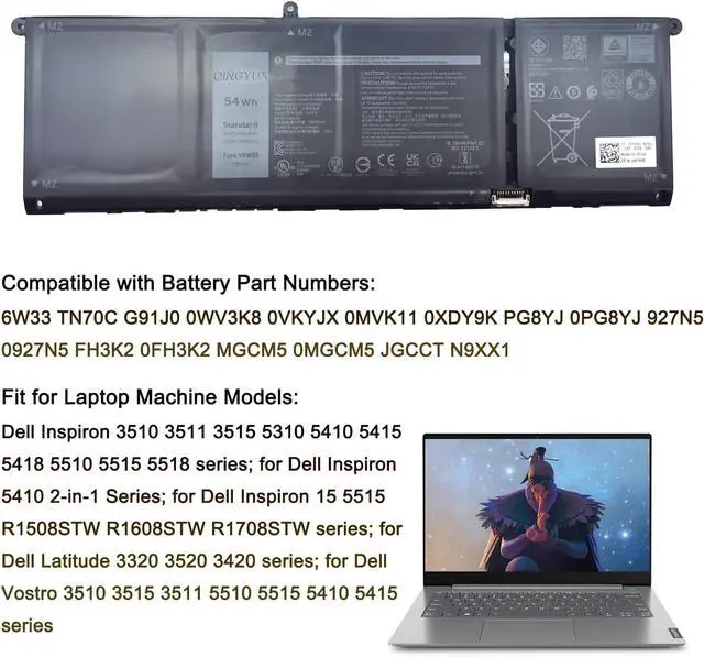Compatible With Battery Part Number: V6W33 TN70C G91J0 0WV3K8 0VKYJX 0MVK11 0XDY9K PG8YJ 0PG8YJ 927N5 0927N5 FH3K2 0FH3K2 MGCM5 0MGCM5 JGCCT N9XX1