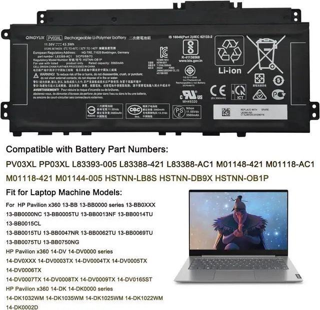 Replacement for Part Number: PV03XL PP03XL L83393-005 L83388-421 L83388-AC1 M01148-421 M01118-AC1 M01118-421 M01144-005 HSTNN-LB8S HSTNN-DB9X HSTNN-OB1P 3ICP/5/68/73 Laptop Notebook Battery