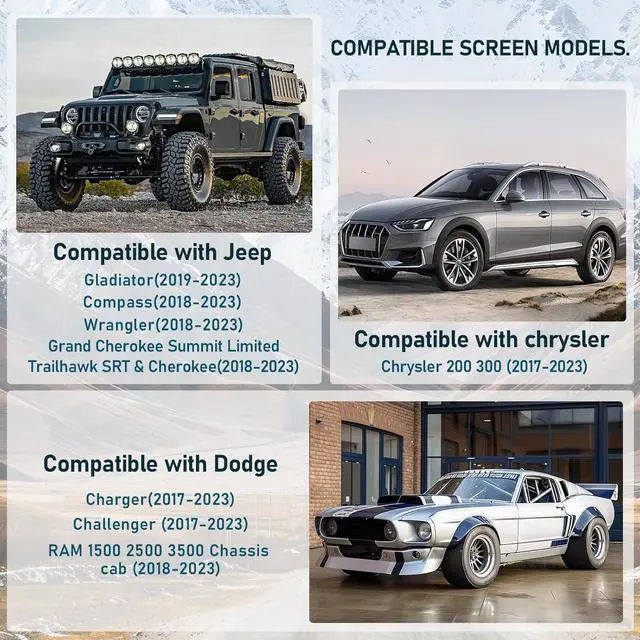 • for Jeep wangler 2018-2020 , for Jeep compass 2018-2020 , for Dodge Durango 2018-2020 , for RAM 1500 2500 3500 Chassis Cab 2018-2020 .