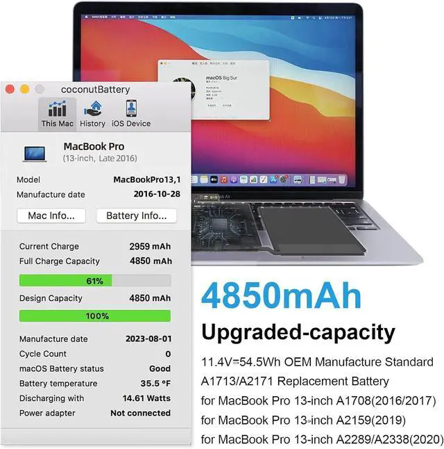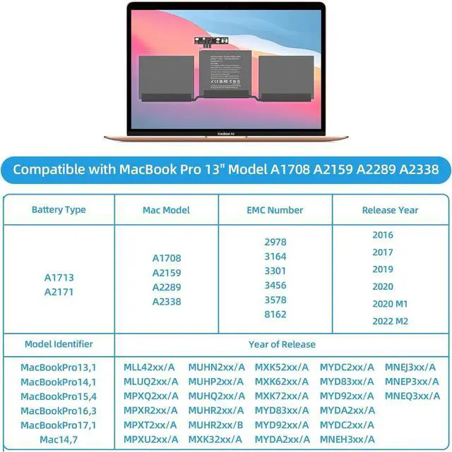 for MacBook Pro 13" Late 2016Model A1708 EMC 2978 (Model Identifier: MacBookPro13,1), Battery Type Number: A1713 (Compatible P/N: MLL42xx/A, MLUQ2xx/A)for MacBook Pro 13" Mid 2017Model A1708 EMC 3164 (Model Identifier: MacBookPro14,1), Battery Type Number: A1713 (Compatible P/N: MPXQ2xx/A, MPXR2xx/A)for MacBook Pro 13" Mid 2017Model A1708 EMC 3164 (Model Identifier: MacBookPro14,1), Battery Type Number: A1713 (Compatible P/N: MPXT2xx/A, MPXU2xx/A)for MacBook Pro 13 inch 2019Model A2159 EMC 3301 (Model Identifier: MacBookPro15,4), Battery Type Number: A2171 (Compatible P/N: MUHN2xx/A, MUHP2xx/A)for MacBook Pro 13 inch 2019Model A2159 EMC 3301 (Model Identifier: MacBookPro15,4), Battery Type Number: A2171 (Compatible P/N: MUHQ2xx/A, MUHR2xx/A, MUHR2xx/B)for MacBook Pro 13 inch 2020Model A2289 EMC 3456 (Model Identifier: MacBookPro16,3), Battery Type Number: A2171 (Compatible P/N: MXK32xx/A, MXK52xx/A)for MacBook Pro 13 inch 2020Model A2289 EMC 3456 (Model Identifier: MacBookPro16,3), Battery Type Number: A2171 (Compatible P/N: MXK62xx/A, MXK72xx/A)for MacBook Pro 13" 2020 M1Model A2338 EMC 3578 (Model Identifier: MacBookPro17,1), Battery Type Number: A2171 (Compatible P/N: MYDA2LL/A, MYDA2**/A) Go to the System Report and find the Power option under list to check the battery capacity and health condition.