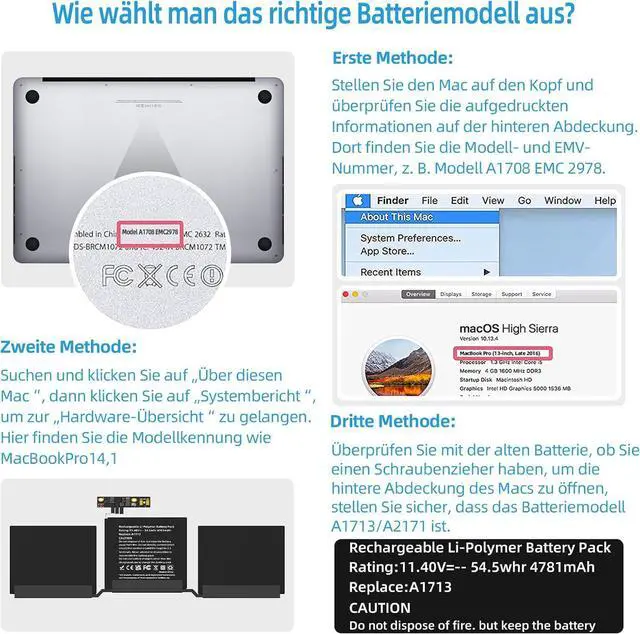 1. Upside down the Mac, and the battery type is printed on the bottom cover, like Model A1708 EMC 2978.