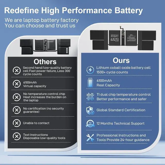 Battery Advantages 1.More than 1500+ recharge cycles over the life of the battery; 2.100% Safe with Upgrade chip to ensure 6-fold protection, eg.Intelligent temperature control--Over heat protection, Over charging protection, Short circuit protection.. ... Without (swollen battery) Damage to laptop, 3. High Performance Electric Core, Real capacity can ensure the long operating time after charging full