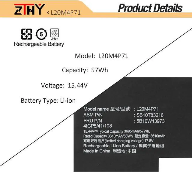 Compatible Part NumberL20C4P71 L20L4P71 L20M4P71 L20D4P71 SB10T83215 SB10T83216 SB10T83217 5B10W13972 5B10W13973 5B10W13974 5B10W13975Compatible ModelReplacement for Lenovo ThinkPad X1 Yoga 2021 Series;Compatible ModelReplacement for Lenovo ThinkPad X1 Yoga 2022 Series;Compatible ModelReplacement for Lenovo ThinkPad X1 Yoga 2021 6th Gen (Type 20XY, 20Y0) Series;Compatible ModelReplacement for Dell Precision 7780 Series.Compatible ModelReplacement for Lenovo ThinkPad X1 Yoga 2023 8th Gen (Type 21HQ, 21HR) Series;Compatible ModelReplacement for Lenovo ThinkPad X1 Carbon 2021 Series;Compatible ModelReplacement for Lenovo ThinkPad X1 Carbon 2022 Series;Compatible ModelReplacement for Lenovo ThinkPad X1 Carbon 2021 9th Gen (Type 20XW, 20XX) Series;Compatible ModelReplacement for Lenovo ThinkPad X1 Carbon 2022 10th Gen (Type 21CB, 21CC) Series;Compatible ModelReplacement for Lenovo ThinkPad X1 Carbon 2023 11th Gen (Type 21HM, 21HN) Series.AttentionIf you install the battery, you find that the laptop cannot detect the battery or the battery level cannot be displayed normally. Please check whether the battery cable is installed properly. Sometimes the battery cannot be charged because the cable is not fixed properly. What do I need to be aware of when I receive a battery?