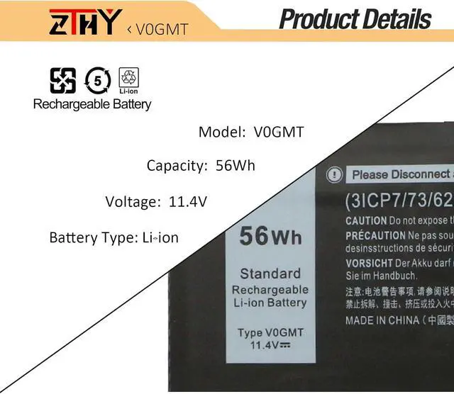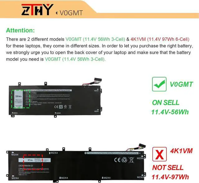 Compatible Part NumberV0GMT NYD3W 0NYD3W NCC3D 0NCC3D 4K1VM W62W6 0W62W6 XYCW0 0XYCW0 9TM7D 09TM7D VOGMT 0V0GMT TJDRR 0TJDRR 3ICP7/73/62Compatible ModelReplacement for Dell G7 17 7700 Series;Compatible ModelReplacement for Dell Vostro 7500 7590 Series;Compatible ModelReplacement for Dell XPS 15 7590 9550 9560 9570 Series;Compatible ModelReplacement for Dell Precision 5510 5520 5530 5540 Series (Note: Not fit for Precision 5530 2-in-1 Series.)Compatible ModelReplacement for Dell Inspiron 15 7500 7501 7590 7591 Series (Note: Not fit for Inspiron 7590 2-in-1 & Inspiron 7591 2-in-1 Series.)NoteThere are 2 different models V0GMT (11.4V 56Wh 3-Cell) & 4K1VM (11.4V 97Wh 6-Cell) for these laptops, they come in different sizes. In order to let you purchase the right battery, we strongly urge you to open the back cover of your laptop and make sure that the battery model you need is V0GMT (11.4V 56Wh 3-Cell).NoteIf you install the battery, you find that the device cannot detect the battery or the battery level cannot be displayed normally. Please check whether the battery cable is installed properly. Sometimes the battery cannot be charged because the cable is not fixed properly. What do I need to be aware of when I receive a battery?