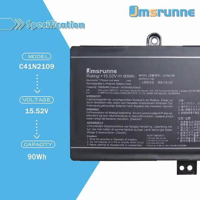 ASUS C41N2109 Specifications Model: C41N2109 / Voltage: 15.2V / Capacity: 90Wh /Battery type: Li-ion. /Battery life: Up to 1000 recharge cycles over the life of the battery. Also comes with installation tools.Purchasing Note: Due to the complexity of laptop battery models, you may not be able to accurately determine the model you need to purchase,Please open the back cover of the laptop to confirm the original battery model number