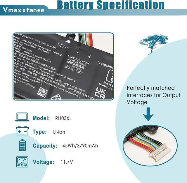 HP RH03XL laptop Battey Specifications Model: RH03XL . Voltage: 11.4V . Capacity:45Wh/3790mAh . Condition: 100% brand New from Manufacturer.