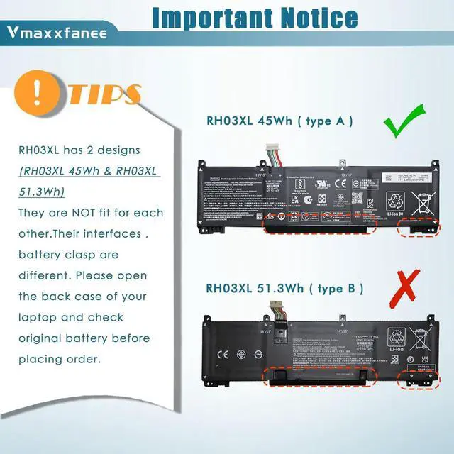 NoteRH03XL has 2 designs (RH03XL 45Wh & RH03XL 51.3Wh) They are NOT fit for each other.Theirinterfaces , battery clasp are different. Please open the back case of yourlaptop and check original battery before placing order.This listing is RH03XL 45Wh.