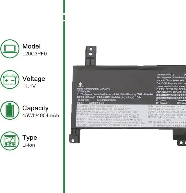 Model: L20C3PF0 // Voltage: 11.1V // Capacity: 45Wh 4054mAh // Color: Black // Type: Plug & Play Li-ion Battery.