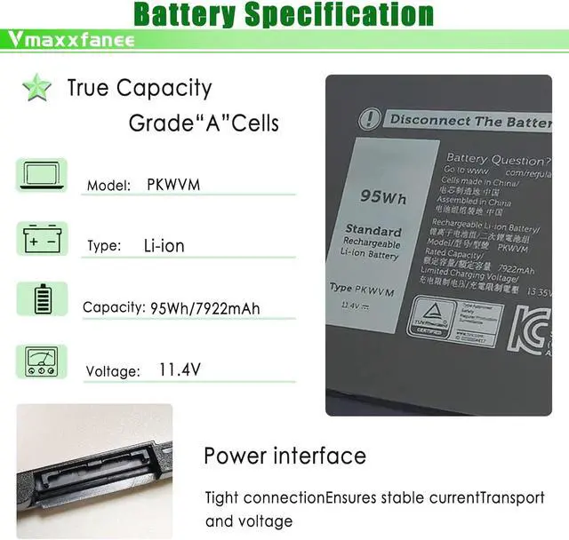 Specifications Model: PKWVM . Voltage: 11.4V . Capacity:95Wh/7922mAh . Condition: 100% brand New from Manufacturer.