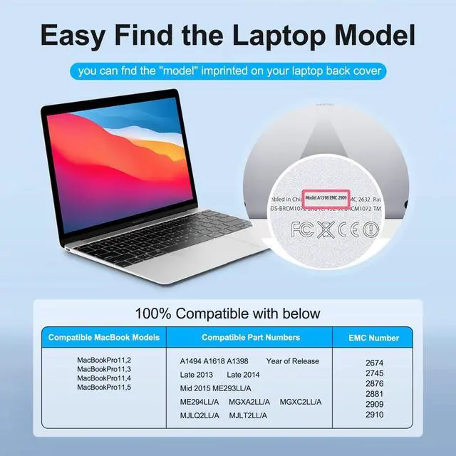 Compatible ModelsMacBook Pro 15" Retina A1494 A1618 A1398 Mid 2015 Ver MJLQ2LL/A MJLT2LL/A MJU2LL/A MJLQ2CH/A MJLT2CH/A MJLU2CH/A EMC 2909 2910