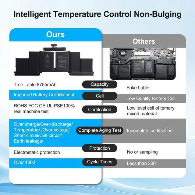 Operating life and certificationUL-/CE-/FCC-/RoHS-Certified/PSE Report for safety. Cobalt Proportion: >98%. Upgrade chip -- Up to 1000+ recharge cycles over the life of the battery,Each products has undergone rigorous testing to ensure the correct voltage, circuit protection, stable current, low self-discharge and CE / FCC / RoHS Certified for safety