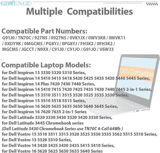 Compatible Model for Dell Inspiron 13 5330 5320 5310 Series, 14 5410 5415 5418 5420 5425 5435 5430 5440 5445 Series, 14 Plus 7420 7430 7440 Series, 14 5410 7415 7420 7425 7435 7430 7440 7445 2-in-1 Series, 15 3510 3511 3515 3520 3525 3535 3530 Series, 15 5510 5518 5515 Series, 16 5620 5625 5635 5630 5640 5645 Series, 16 7620 7635 2-in-1 Series for Dell Latitude 3320 3330 3430 3520 3420 3530 Series, 3445 Chromebook series (Dell Latitude 5430 Chromebook Series use TN70C 4-Cell 64Wh ) for Dell Vostro 15 3510 3511 3515 3520 3525 3530 3535 3562 5515 5510 Series, 13 5320 5310 Series, 14 3420 3425 3430 3435 5415 5410 Series,16 5620 5625 5630 5635 5640 Series