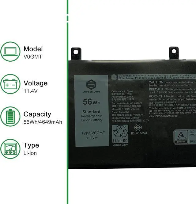 Model: V0GMT // Voltage: 11.4V // Capacity: 56Wh 4649mAh // Color: Black // Type: Plug & Play Li-ion Battery.