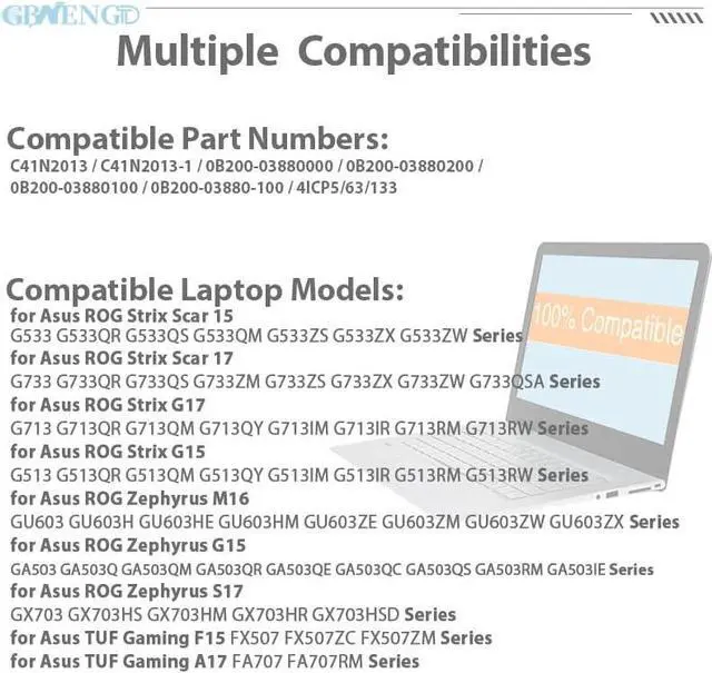 Compatible Model for Asus ROG Strix Scar 15 G533 G533QR G533QS G533QM G533ZS Series for Asus ROG Strix Scar 17 G733 G733QR G733QS G733ZM G733ZS Series for Asus ROG Strix G17 G713 G713QR G713QM G713QY G713IM G713IR G713RM G713RW Series for Asus ROG Strix G15 G513 G513QR G513QM G513QY G513IM G513IR G513RM G513RW Series for Asus ROG Zephyrus M16 GU603 GU603H GU603HE GU603HM GU603ZESeries for Asus ROG Zephyrus G15 GA503 GA503Q GA503QM GA503QR GA503QE GA503QC GA503QS GA503RM GA503IE Series for Asus ROG Zephyrus S17 GX703 GX703HS GX703HM GX703HR GX703HSD Series for Asus TUF Gaming F15 FX507 FX507ZC FX507ZM Series for Asus TUF Gaming A17 FA707 FA707RM Series Notebook