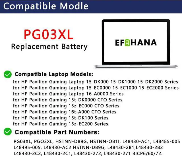 Compatible Part NumberPG03XL, PGO3XL, HSTNN-DB9G, HSTNN-OB1I, L48430-AC1, L48485-005, L48495-005, L48430-AC2 HSTNN-DB9G, L48430-2B1, L48430-2B2, L48430-2C2, L48430-2C1, L48430-272, L48430-271, 3ICP6/60/72.