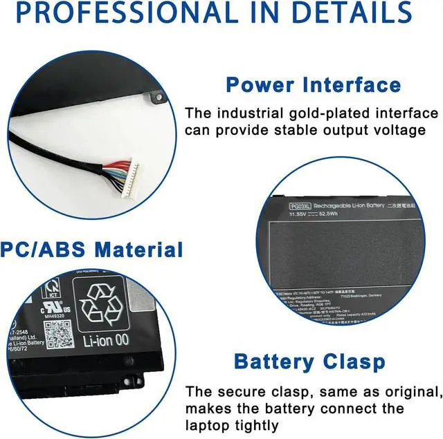 SpecificationsModel: PG03XL // Battery type: Li-ion // Color: Black // Voltage: 11.55V // Capacity: 52.5Wh 4323mAh 3-Cell// 100% New from Manufacturer. Top circuit boards and smart chip