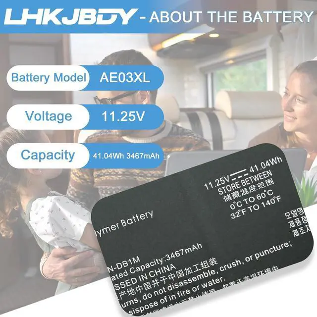 Specifications: Type: AE03XL; Voltage: 11.25V; Capacity: 3467mAh/41.04Wh; Color: Black. Battery type: Lithium-Ion; The Packages includes: 1pcs AE03XL Laptop Battery Replacement, 2pcs Screwdrivers, 1 pcs Instruction for AE03XL Battery. The batteries are certified by UL and CE, ensuring safety and high performance