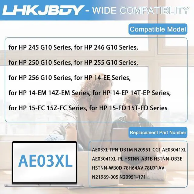 Compatible Laptop Models: AE03XL battery for HP 245 G10 Series, for HP 246 G10 Series, for HP 250 G10 Series, for HP 255 G10 Series, for HP 256 G10 Series, for HP 14-EE Series, for HP 14-EM 14Z-EM Series, for HP 14-EP 14T-EP Series, for HP 15-FC 15Z-FC Series, for HP 15-FD 15T-FD Series