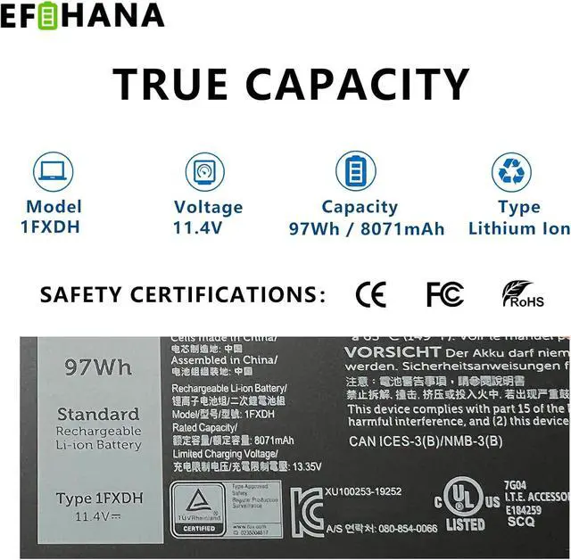 SpecificationsModel:1FXDH // Battery type: Li-ion // Voltage: 11.4V // Capacity: 97Wh/8071mAh // 100% New from Manufacturer. Top circuit boards and smart chip.