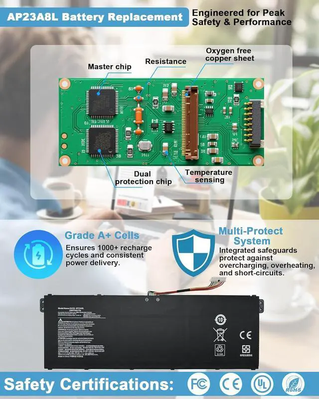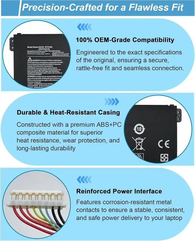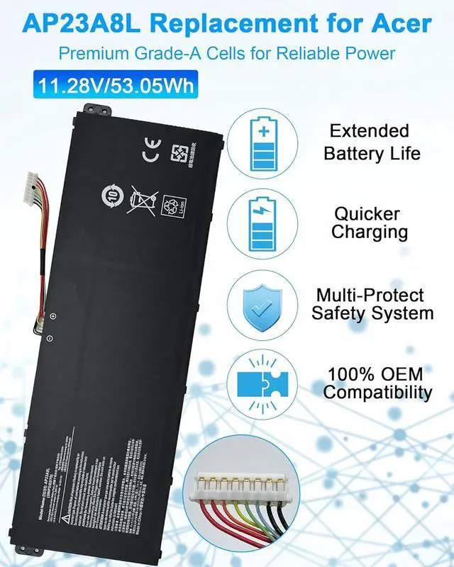 Specifications: Model Name: AP23A8L standard Rechargeable Li-ion Battery; Battery Type: Lithium_ion; Voltage: 11.28 V; Capacity: 53.05 Wh 4703 mAh. Color: Black. Packages includes:1x AP23A8L Laptop Battery, 2 x Screwdrivers for easy installation, 1x Instruction
