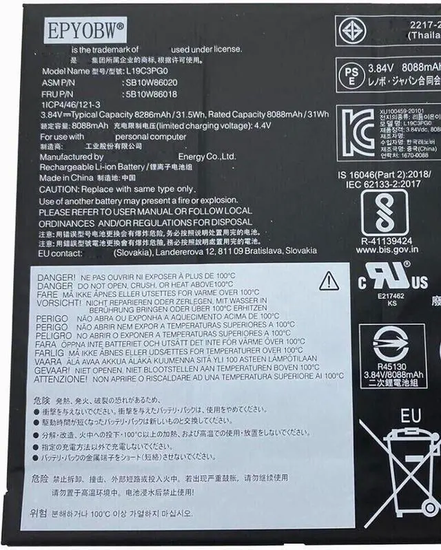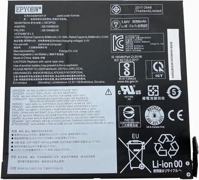 SpecificationsBattery Model: L19C3PG0 / Voltage: 3.84V / Capacity: 31.5Wh 8286mAh 3-Cell / Color: Black / Condition: Brand New.